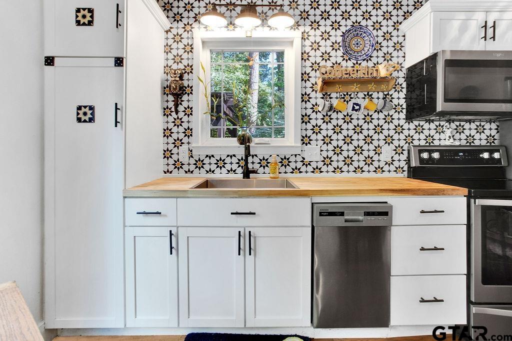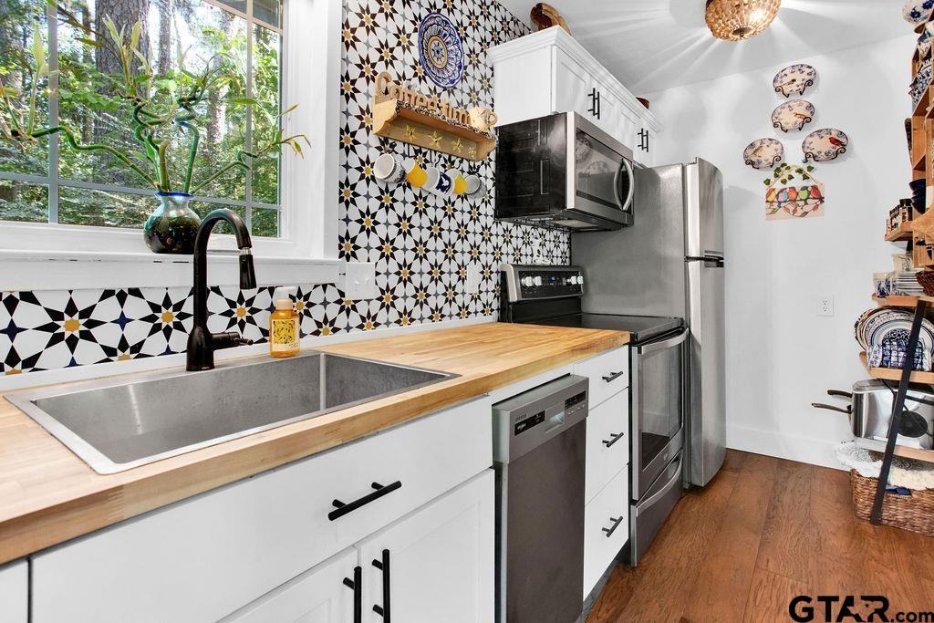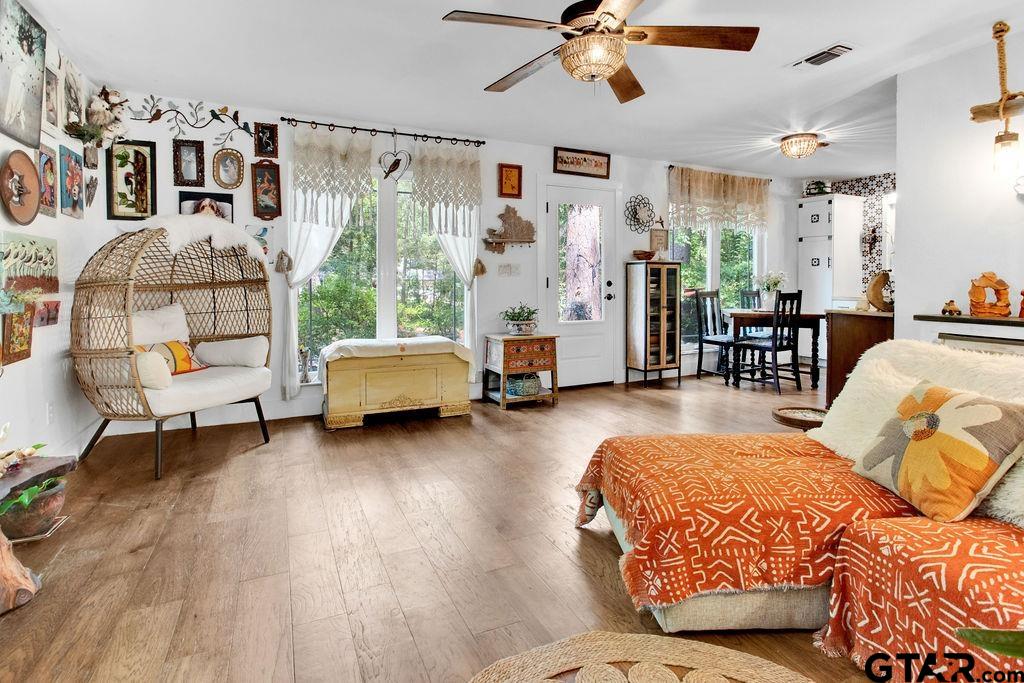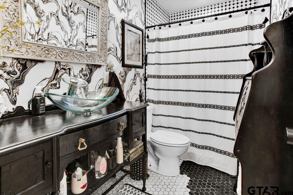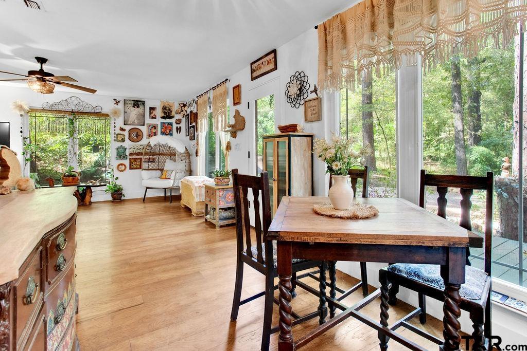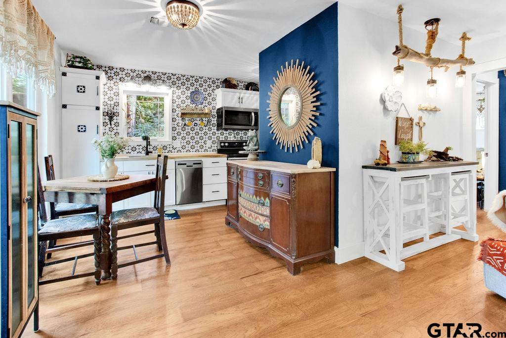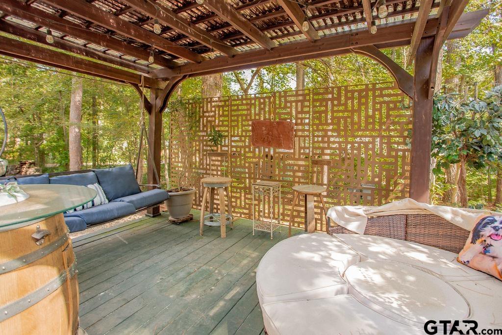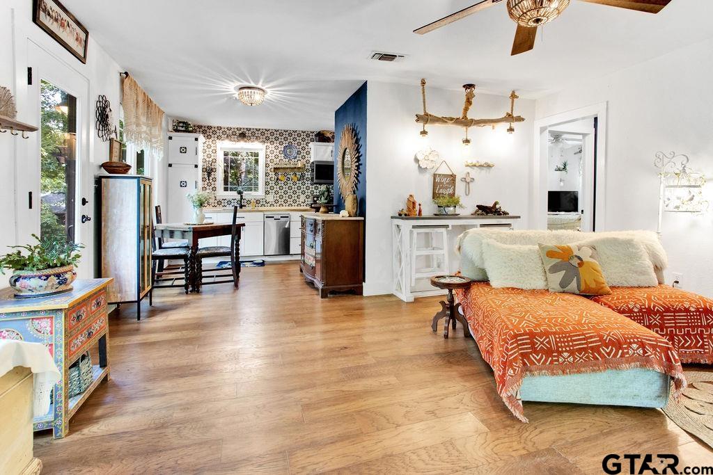 Adorable Hideaway Bungalow Retreat. Welcome to this charming 2-bedroom, 1-bath bungalow, perfectly tucked away near the back gate of Hideaway for easy access while still offering peace and privacy. Situated on a gorgeous lot surrounded by mature trees, this home feels like a hidden woodland retreat. Step inside to find vinyl wood plank flooring throughout, a stylish kitchen with modern tile work and updated appliances, and a cozy bath featuring custom vanity with black & white penny and honeycomb tile details. The primary bedroom opens directly onto a private deck, ideal for morning coffee or winding down at sunset. Multiple outdoor living decks extend your entertaining and relaxation space, making the most of the serene wooded setting. This quaint Hideaway hideout blends character and comfort with modern updates—offering a lifestyle that’s as inviting as it is convenient. Hideaway offers a resort-style living with 24/7 security, 3 lakes, 27-hole golf course, an Olympic-sized pool and multiple parks. Hideaway is in Lindale ISD. |