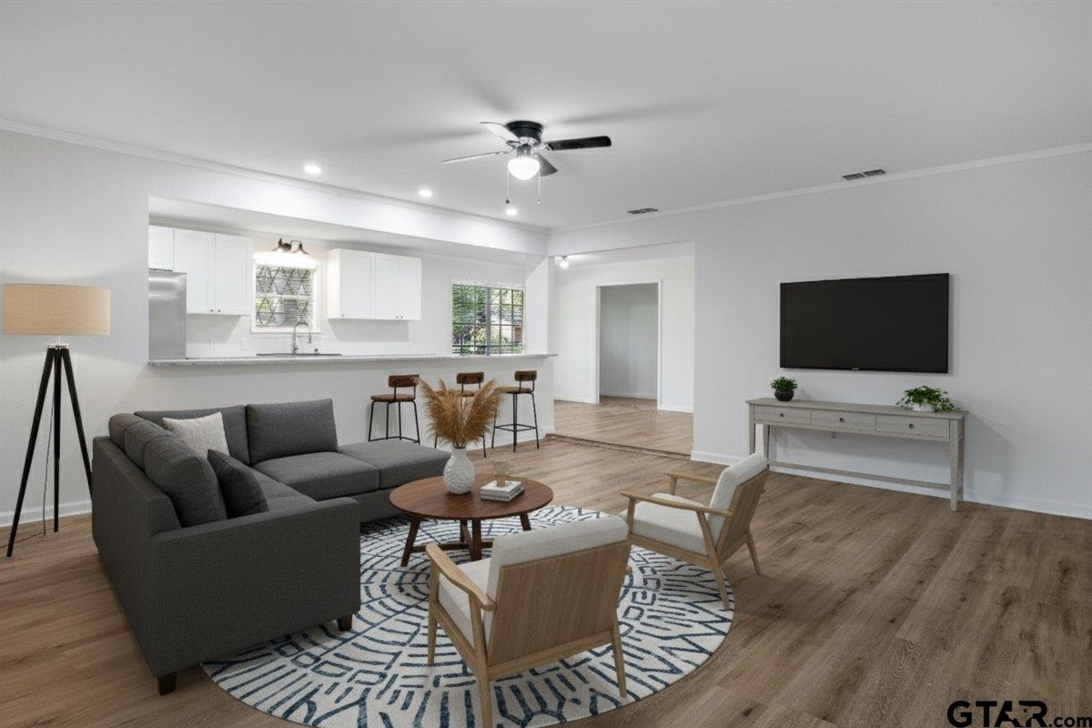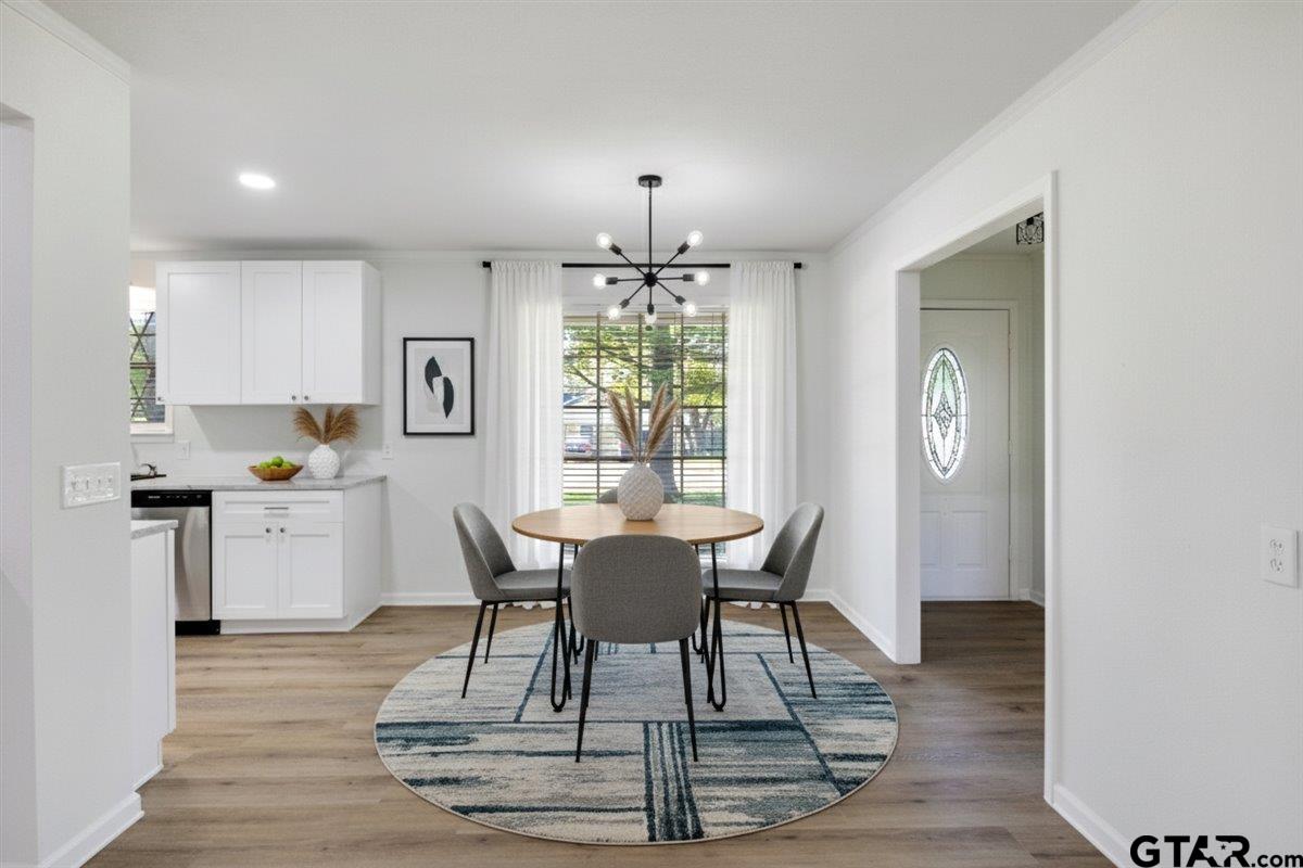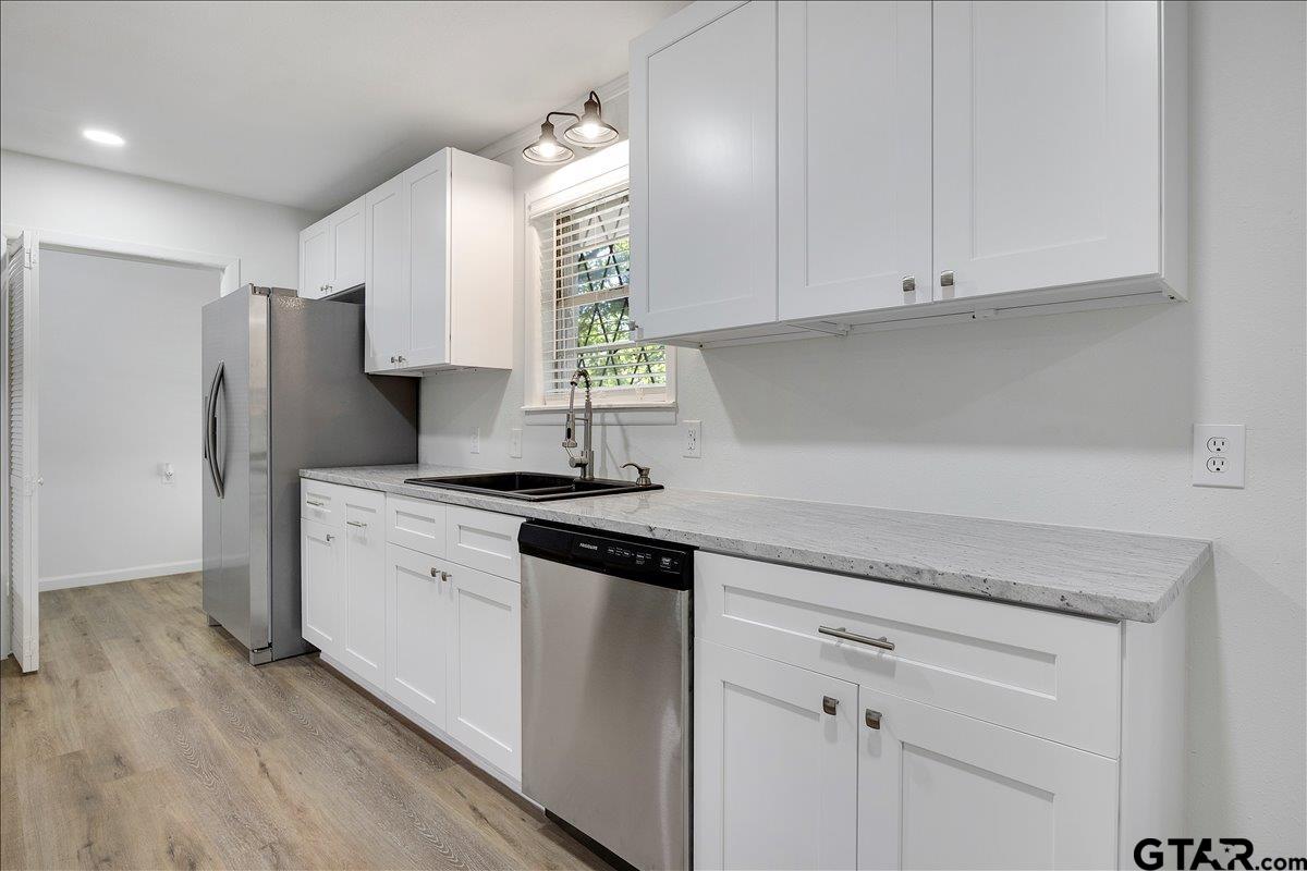 | Beautifully remodeled home in the heart of Lindale, TX. Situated on a corner lot with mature trees, shaded yard and deck to enjoy the view. Inside you'll be pleased with everything brand new! Luxury vinyl plank, carpet, cabinets, countertops, paint, light fixtures, fans, stainless steel stove, dishwasher, microwave and refrigerator, and more! There are 2 living areas, wood burning fireplace, kitchenette and countertop seating. 3 bedrooms and 2 baths. Carport and storage building. New roof in 2024. Move in ready! | |