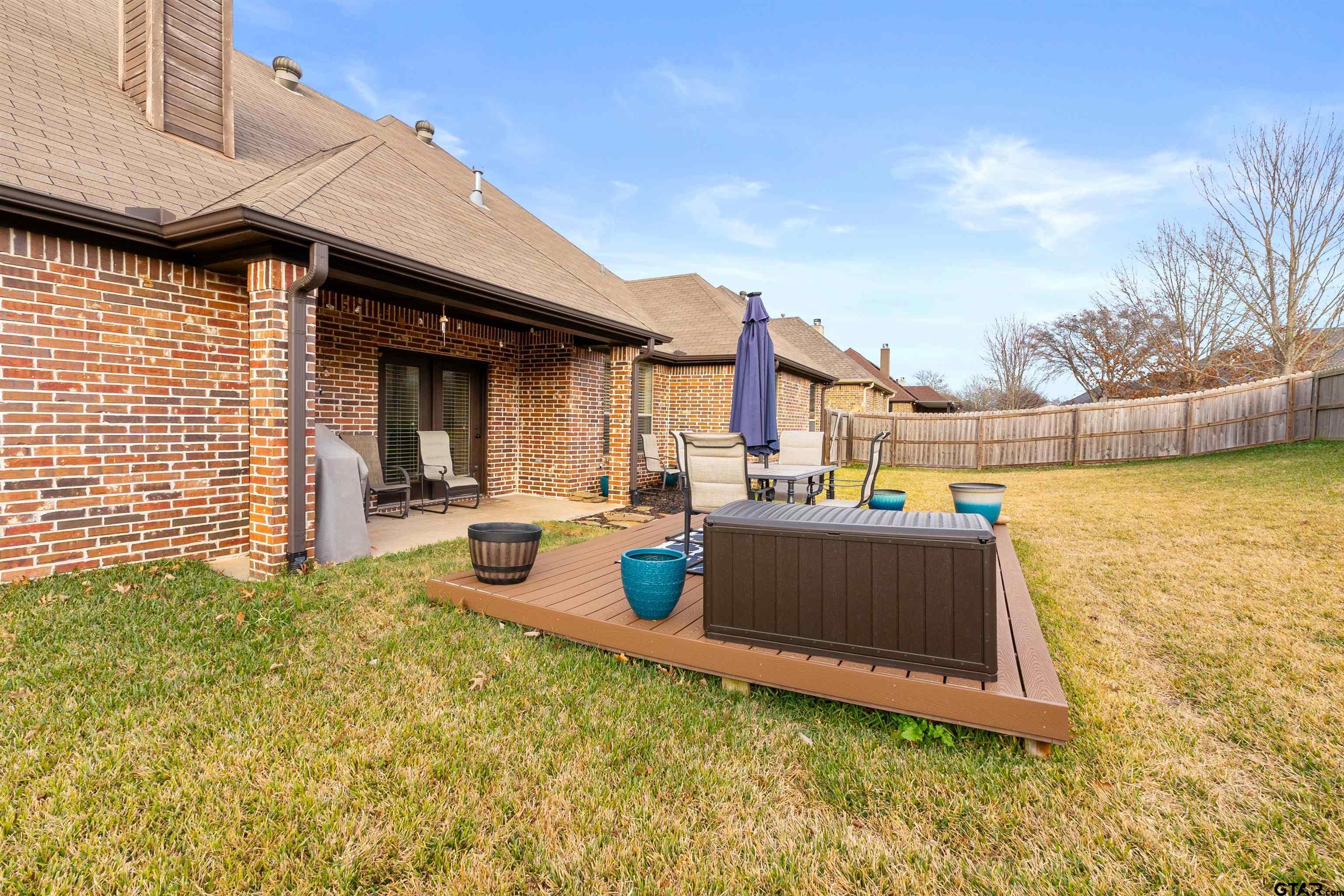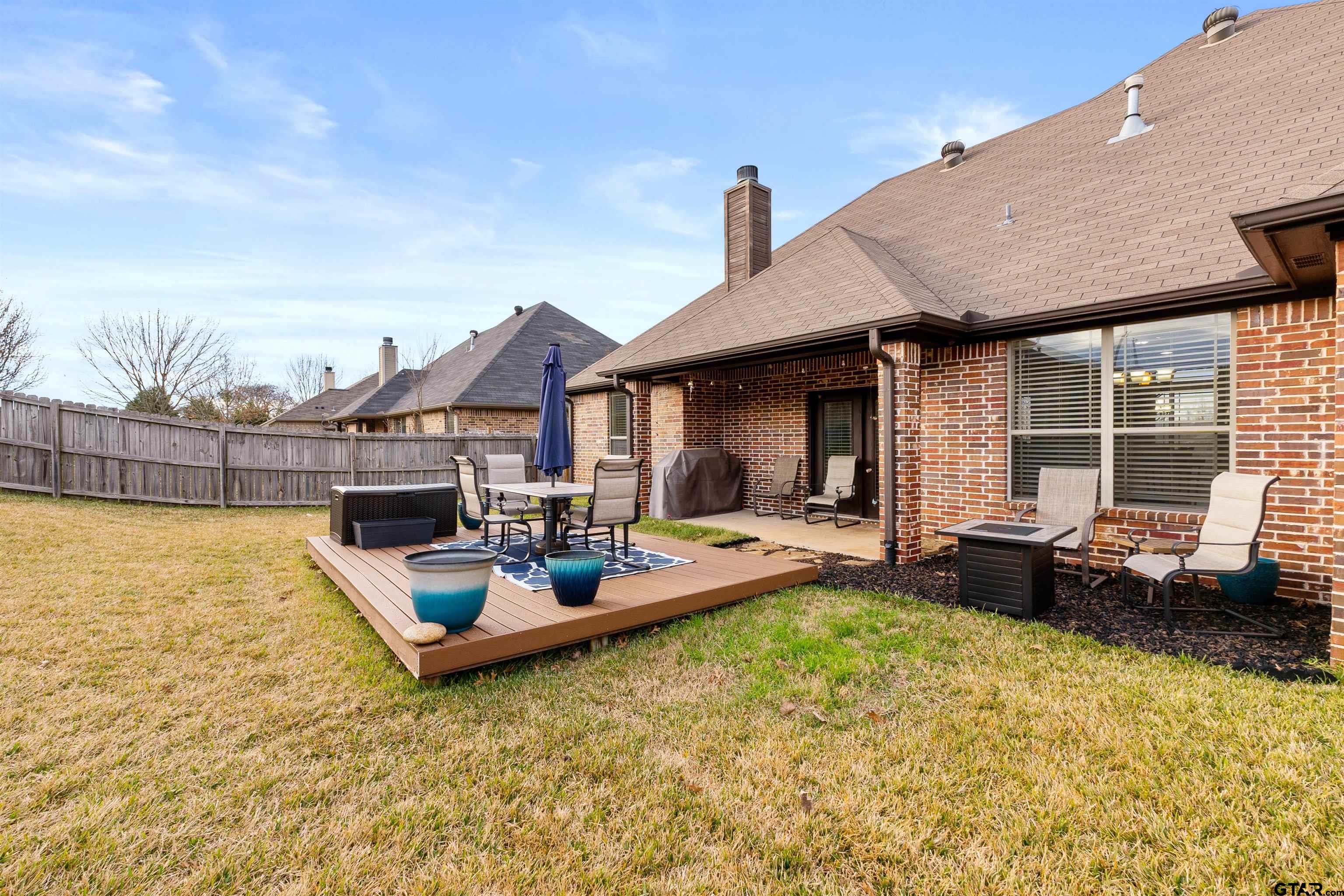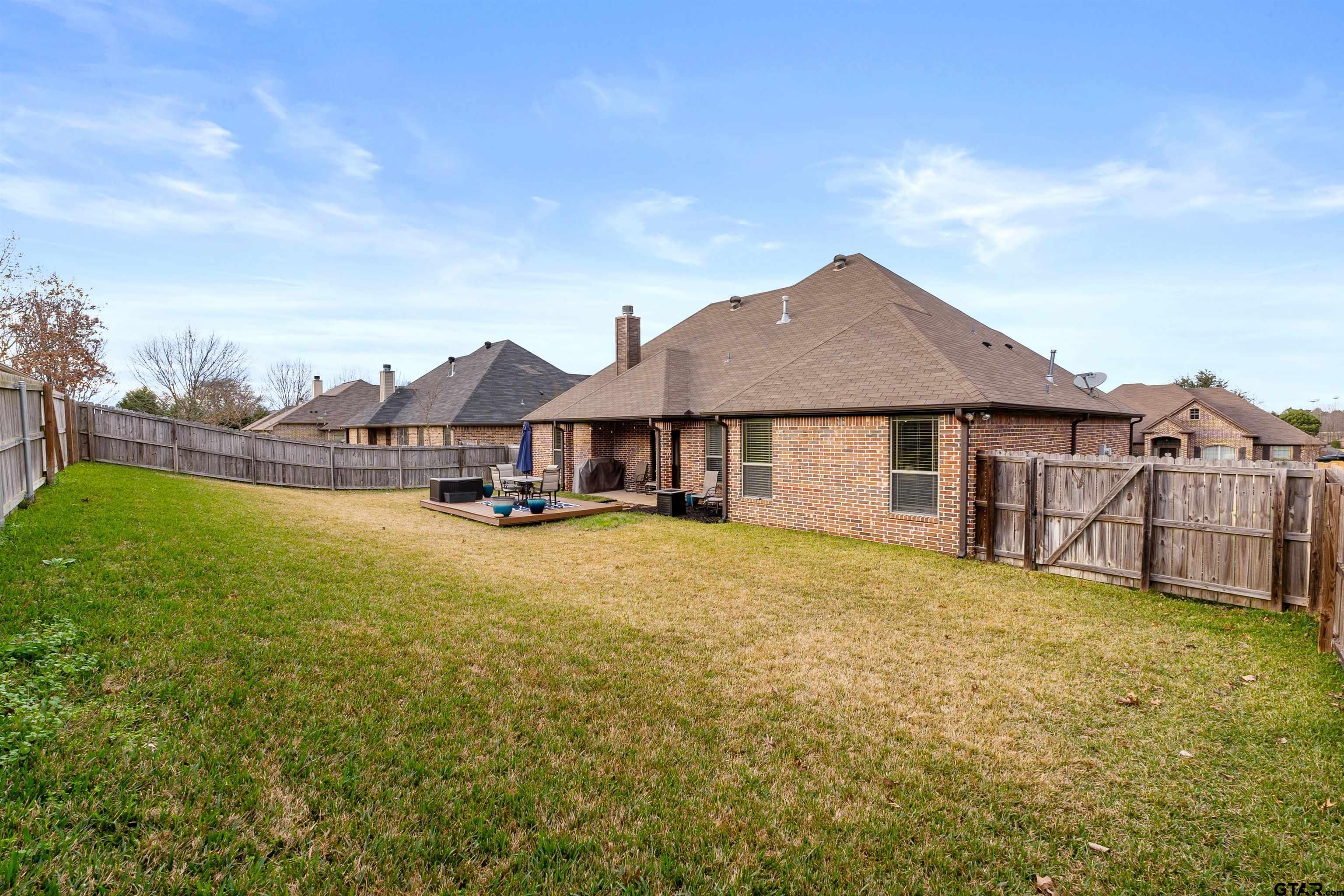 | Introducing 11855 Poydras, Tyler, Texas! This 3-bedroom, 2-bath home offers comfort, functionality, and timeless style. The brick entryway leads to a beautiful entrance via a door with classic iron accents. The easy-living, partial open-concept gives just the right amount of separation from the family room to the kitchen. Note the upgraded trim package around windows as well as the crown molding, all of which adds depth, character, and a custom-built feel. The main living area features a stone fireplace with gas logs and a hearth on which to perch to enjoy a fireside cup of tea. The kitchen offers rich wood cabinetry, granite countertops, stainless steel appliances, and a breakfast bar. With multiple dining options including the breakfast bar, breakfast area, and open formal dining area, you will have lots of flexibility to decide how to use these spaces---extra living space, office space, eating---you name it. The primary suite features a tray ceiling adding more architectural interest. An en-suite bath with double sinks offers a soaking tub, separate shower, separate water closet and walk-in closet. The two additional bedrooms on the opposite side of the home offer flexibility for guests, family, or a home office. The bathroom that serves these bedrooms offers double sinks and a tub/shower combination. Step outside to enjoy a generous, fully fenced backyard with covered patio and long-lasting composite deck for long-lasting durability. Conveniently located in a quiet neighborhood with no drive-through traffic, this home combines classic curb appeal with modern livability—ready for you to make it your own! | |