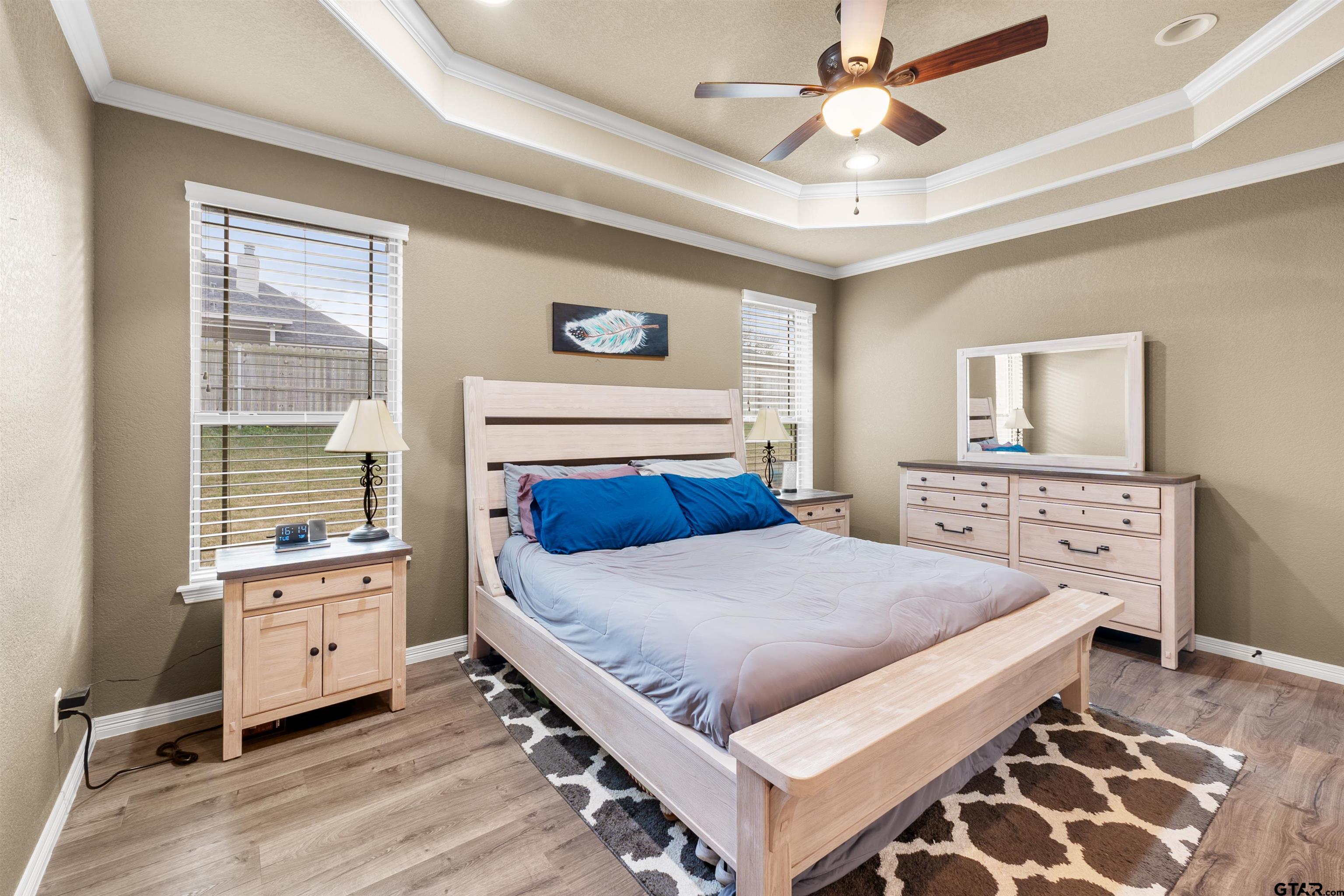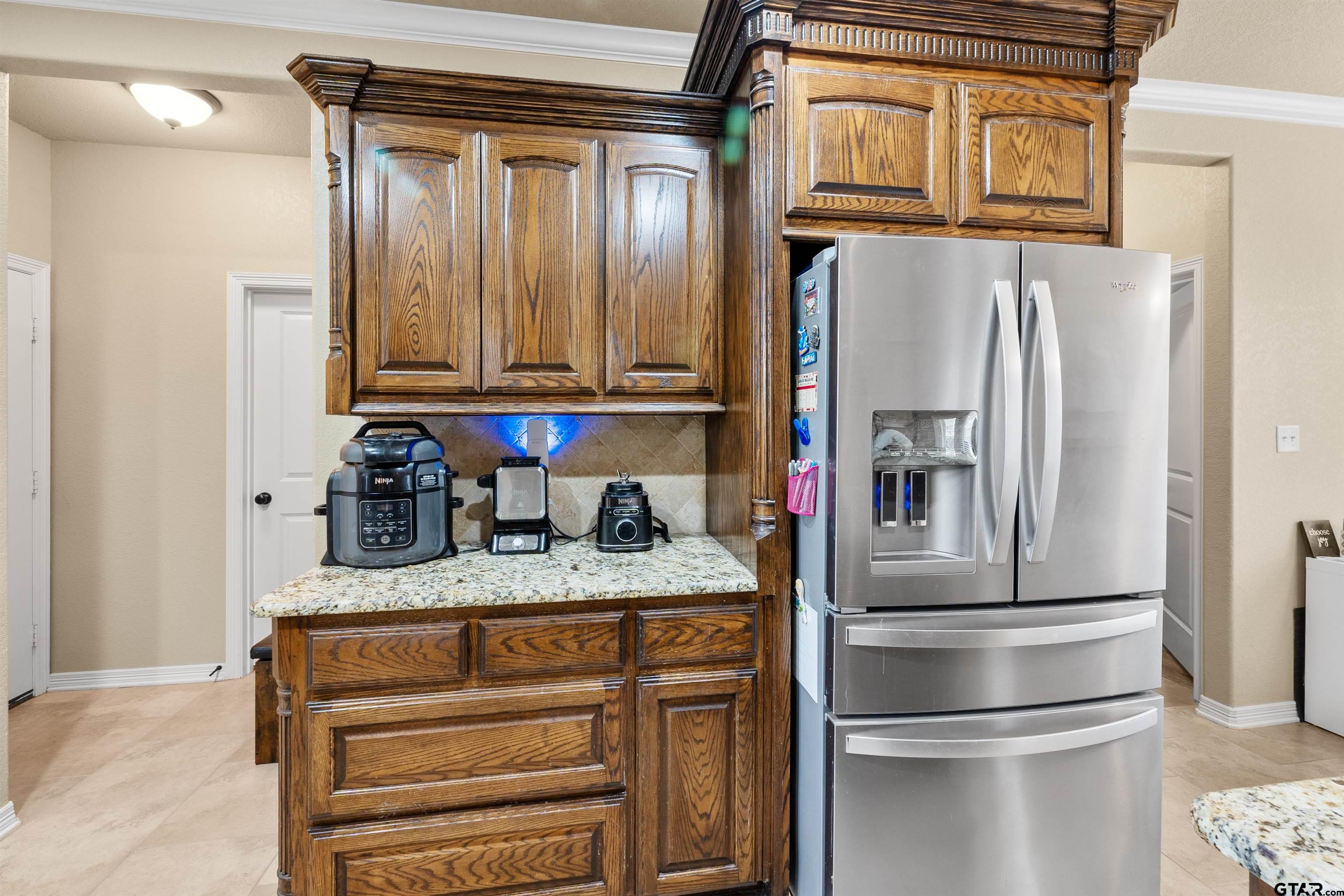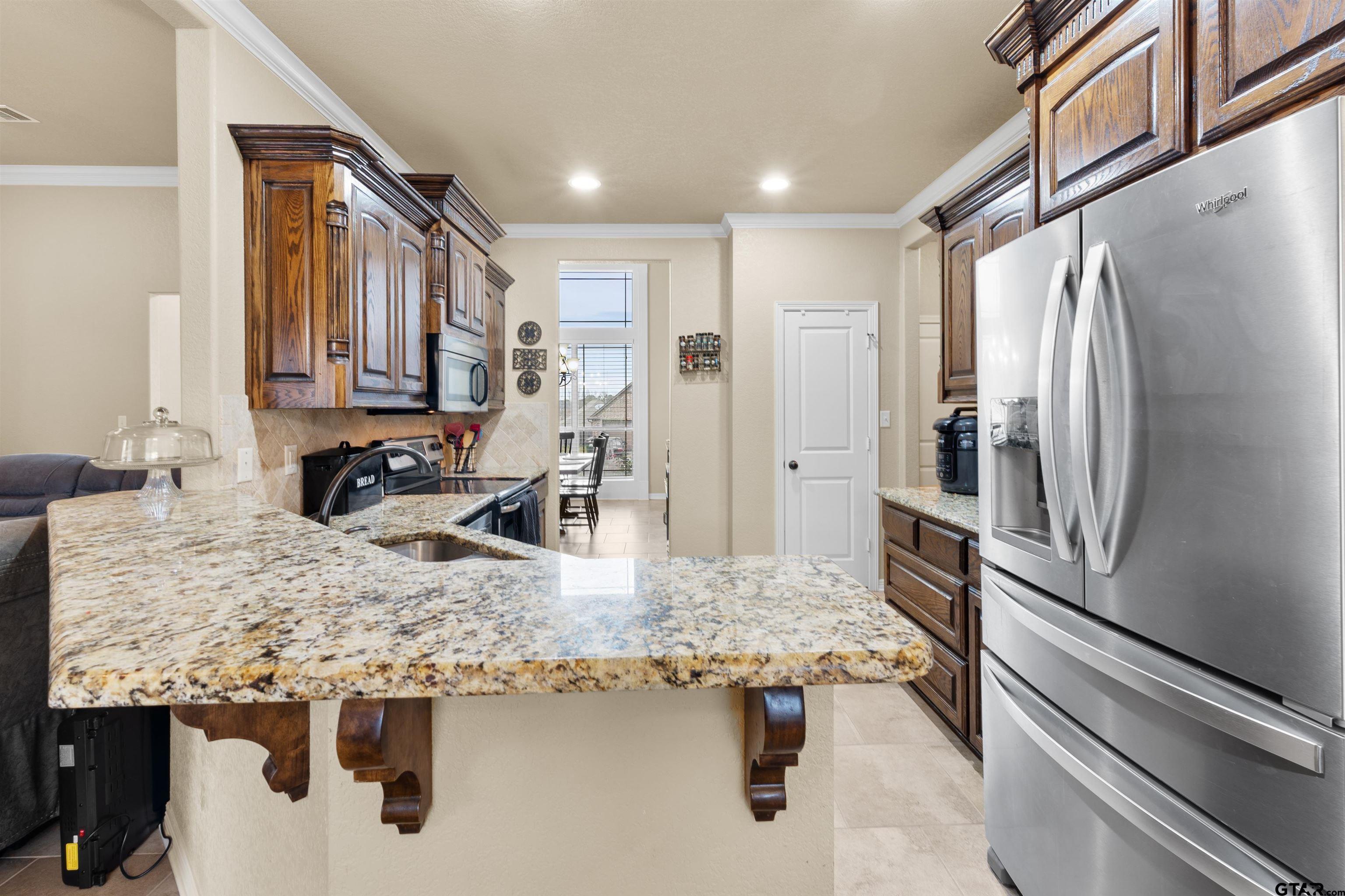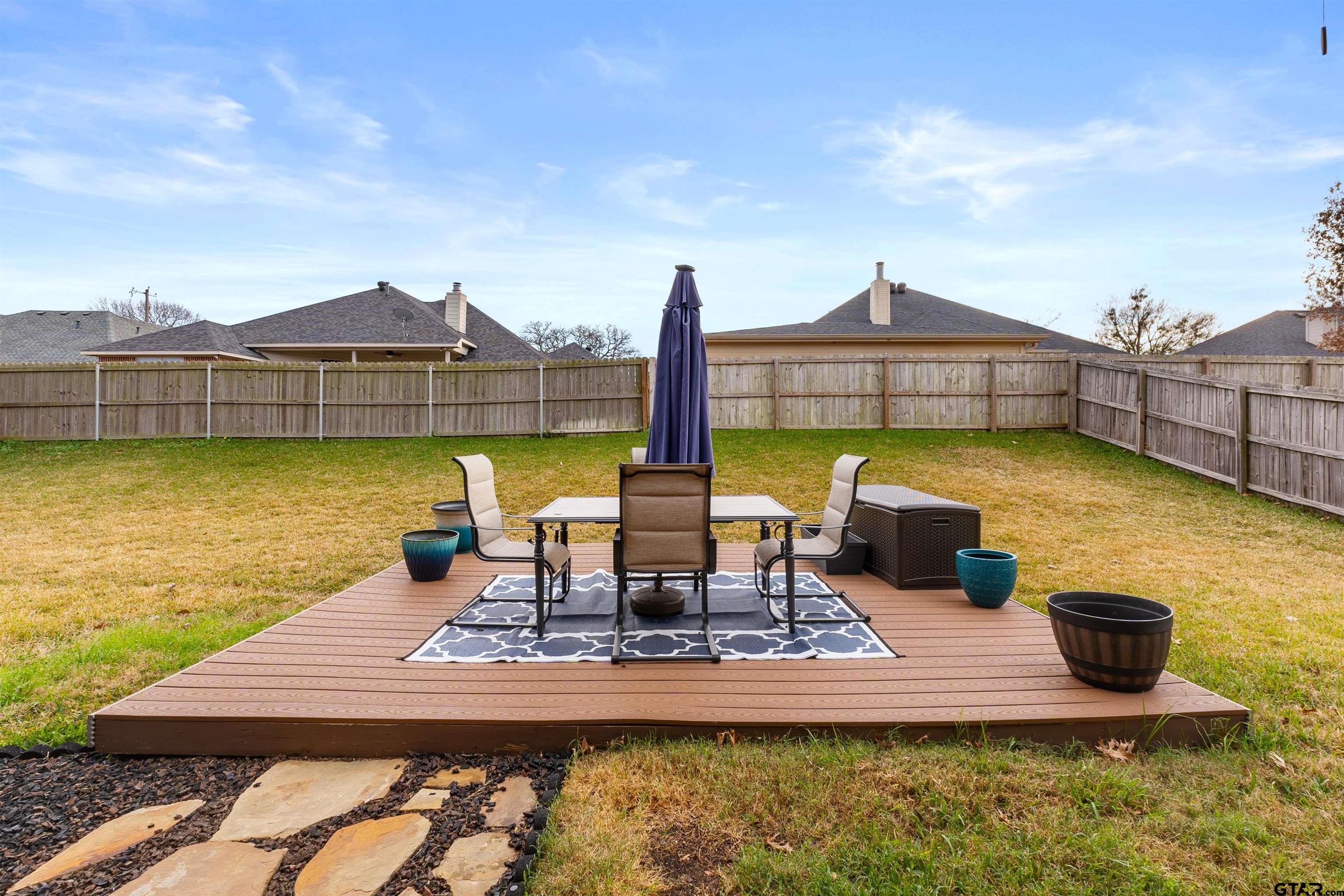 | Introducing 11855 Poydras, Tyler, Texas! This 3-bedroom, 2-bath home offers comfort, functionality, and timeless style. The brick entryway leads to a beautiful entrance via a door with classic iron accents. The easy-living, partial open-concept gives just the right amount of separation from the family room to the kitchen. Note the upgraded trim package around windows as well as the crown molding, all of which adds depth, character, and a custom-built feel. The main living area features a stone fireplace with gas logs and a hearth on which to perch to enjoy a fireside cup of tea. The kitchen offers rich wood cabinetry, granite countertops, stainless steel appliances, and a breakfast bar. With multiple dining options including the breakfast bar, breakfast area, and open formal dining area, you will have lots of flexibility to decide how to use these spaces---extra living space, office space, eating---you name it. The primary suite features a tray ceiling adding more architectural interest. An en-suite bath with double sinks offers a soaking tub, separate shower, separate water closet and walk-in closet. The two additional bedrooms on the opposite side of the home offer flexibility for guests, family, or a home office. The bathroom that serves these bedrooms offers double sinks and a tub/shower combination. Step outside to enjoy a generous, fully fenced backyard with covered patio and long-lasting composite deck for long-lasting durability. Conveniently located in a quiet neighborhood with no drive-through traffic, this home combines classic curb appeal with modern livability—ready for you to make it your own! | |
