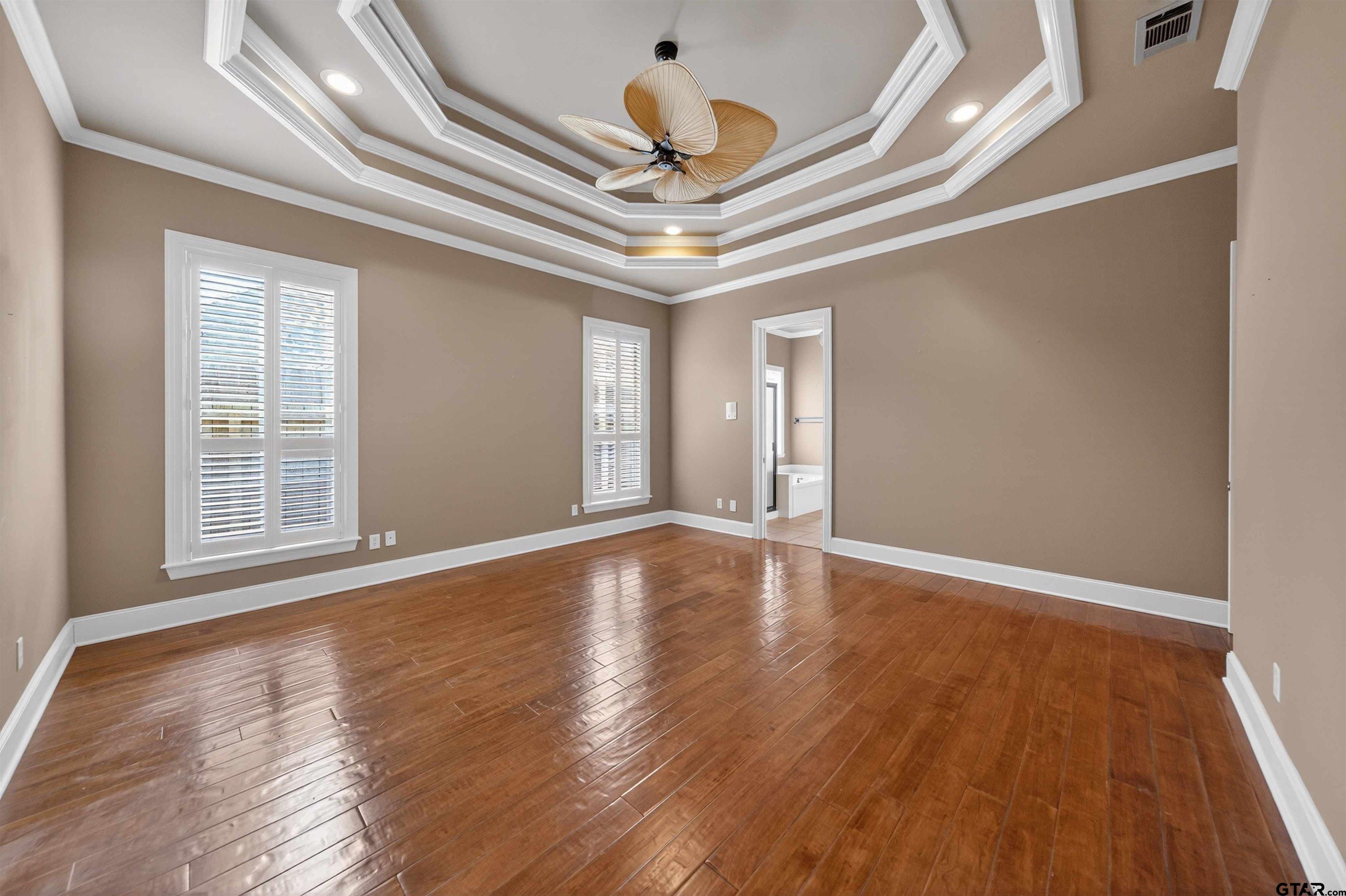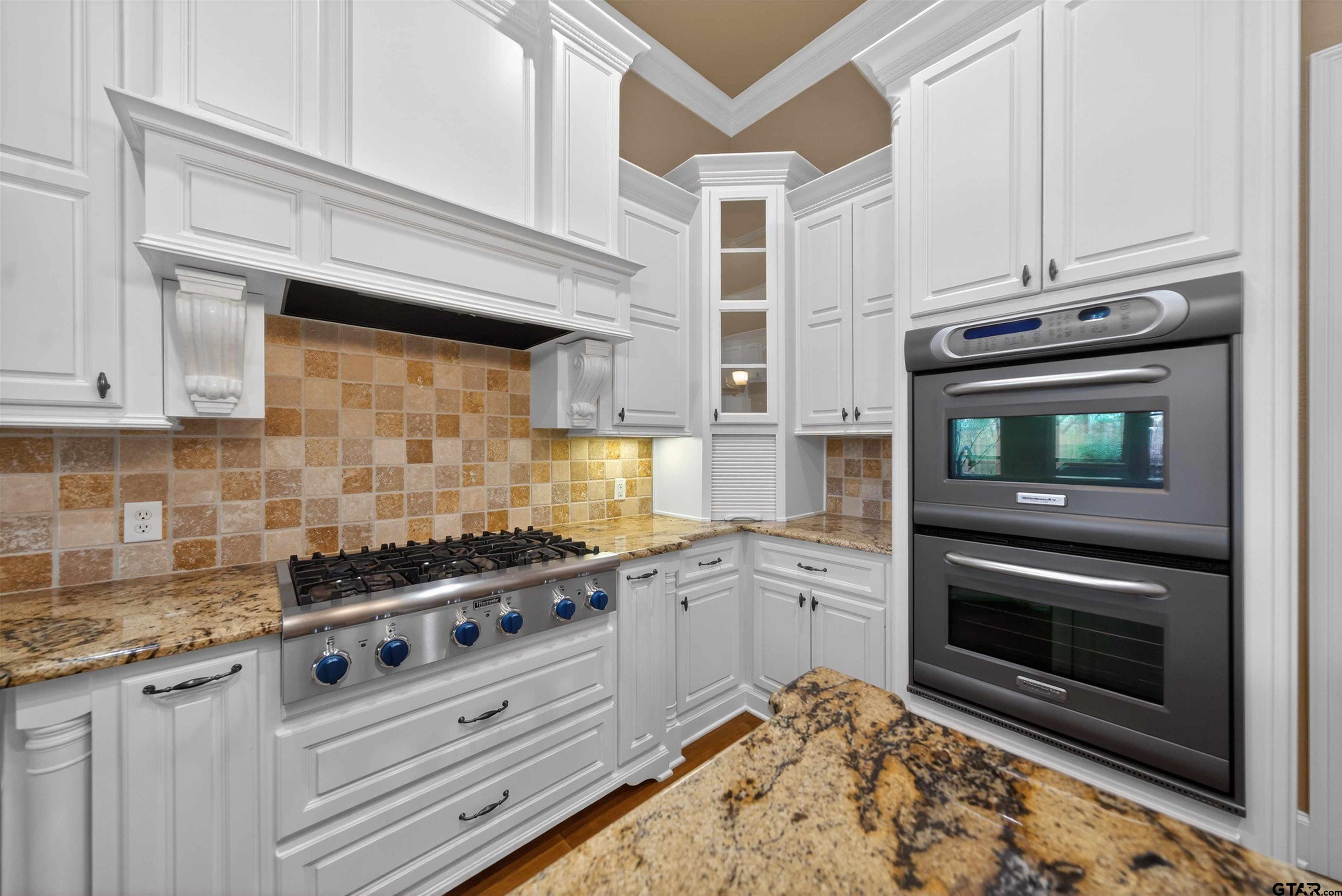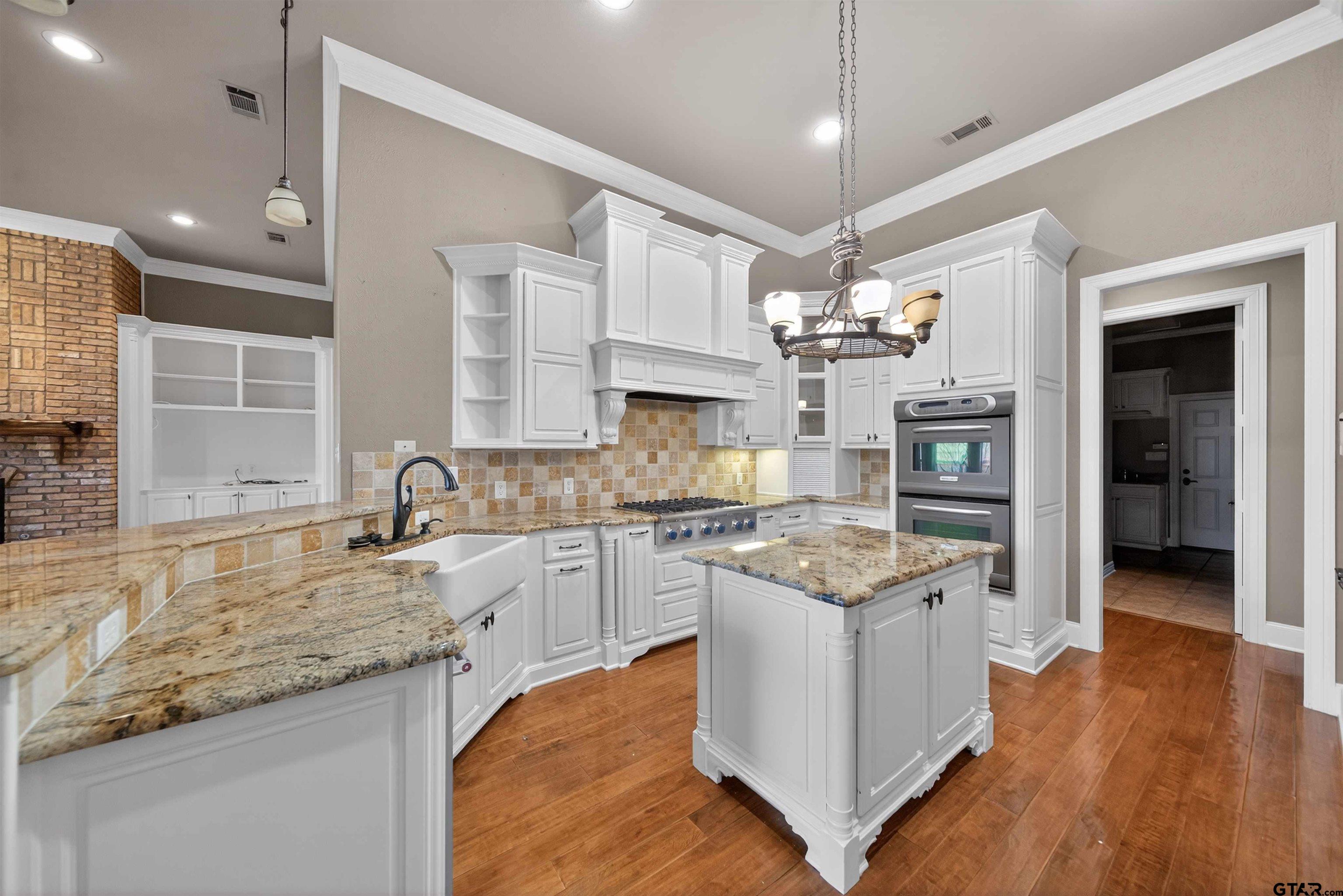 | Stunning custom home in a sought after gated community of South Tyler. Soaring ceilings welcome you into the entryway. Great room with a wall of windows and formal dining area lead to the well appointed kitchen, breakfast room and den with built ins and brick fireplace. Plantation blinds, two gas log fireplaces, wood floors, granite counter tops, crown and base molding, stainless steel appliances and custom designs throughout plus so much more. Warming drawer, electric double ovens, gas cooktop, and pantry. The kitchen is located in the heart of the home. Primary bedroom is separated from the additional bedrooms and boasts a separate shower, jetted tub, double vanities and private water closet and oversized walk in closet with built ins. The secondary bedrooms share a jack and jill bathroom. One of the secondary bedrooms is the size of a second primary and has access to the enclosed porch. Half bathroom located by the utility room. Enclosed back porch with a stone, gas log fireplace with views of the garden retreat. Walkways venture through the landscaped back yard with views of the fountain. Garage holds two large vehicles. Storage rooms, work bench and back yard access. This is a MUST see, so come by today! | |