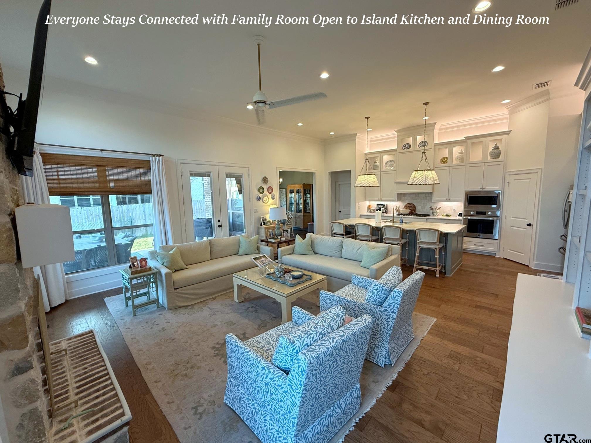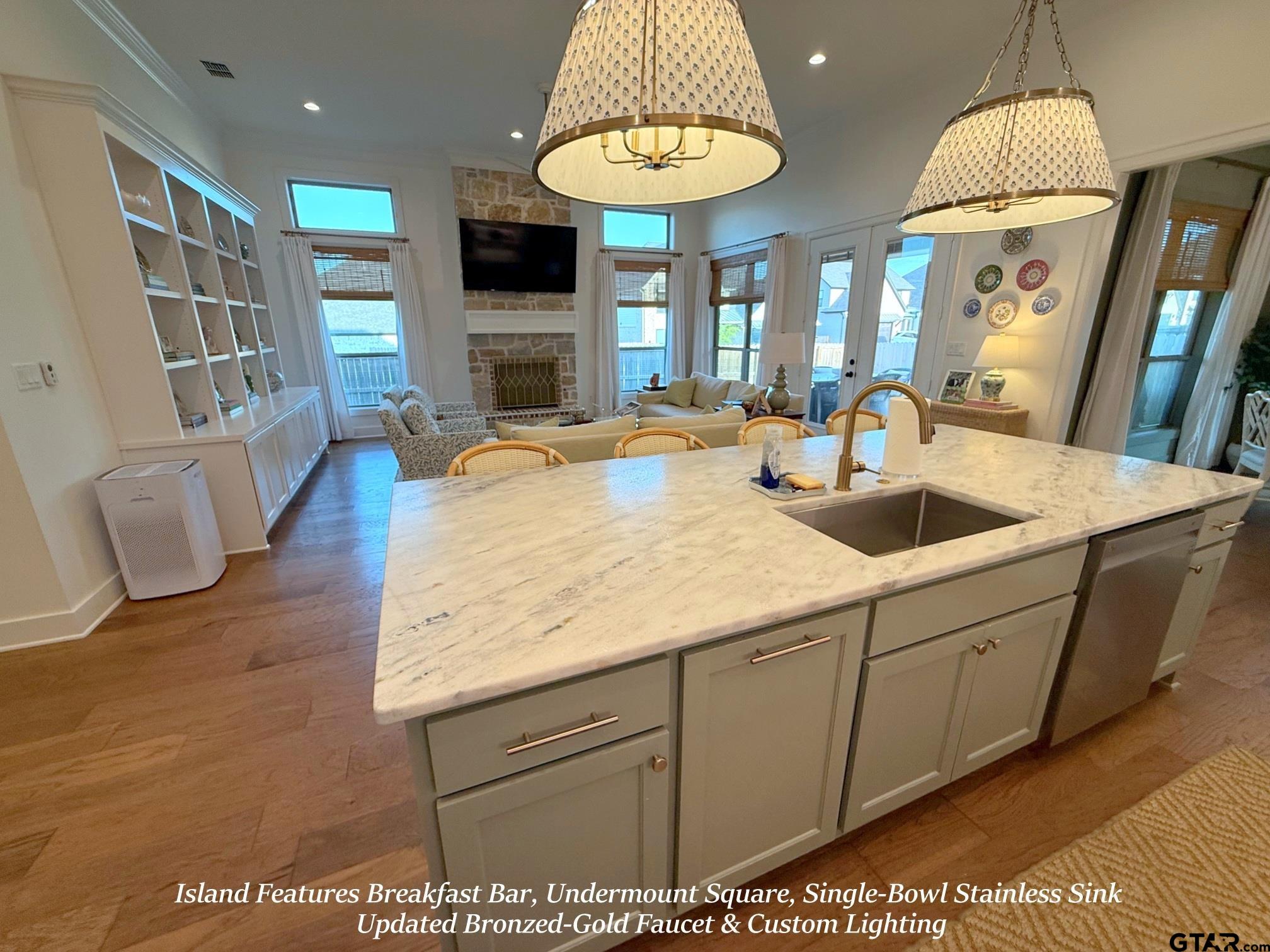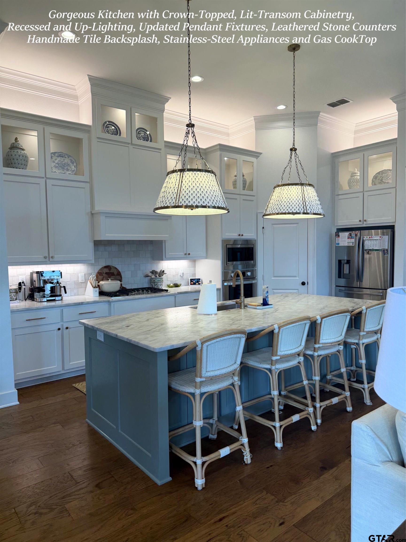 | THIS. HOME. IS. BEAUTIFUL!!! The Stone Arched Entry & 8' Divided Light Entry Door w/Over-Transom opens to 12' Coffered Tray Ceilings w/Updated Fixtures & Gleaming Hardwood Floors that flow Thru-out Entire Home (No Carpet Anywhere!). Continuing on is a Light-Filled Family/Great Rm w/Floor to Ceiling Windows, Custom Built-Ins, Stone Fireplace, Crown Moldings, Recessed Lighting & French Drs to Covered Outdoor Entertaining Area. The Family Rm is open to Island Kitchen w/Leathered Stone Counters, Hand-thrown Tile Backsplash, Soaring Furniture Grade Shaker Cabinets w/Lit Transom Uppers, Recessed & Accent Uplighting, High-End Stainless-Steel Appliances, Updated Bronzed-Gold Faucets, Fixtures, Custom Pendant Lighting & Walk-In Pantry. The Gorgeous Dining Room feels like its own Destination w/Vaulted Plank Ceiling, New Rich, High-Saturation Paint, Upgraded Chandelier & Layered Window Treatments. The Stunning Master Bedroom offers High Tray Ceilings, Crown Moldings, Recessed Lighting & Opens to Spa-Like Master En-Suite w/Separate Vanities w/Leathered Stone Counters, Updated Bronzed-Gold Faucets & Fixtures Throughout, Simple & Classic Free-Standing Tub, Oversized Level-Entry Shower w/Bench Seat, Rain & Wall-Mounted Spray Heads. A Separate Water Closet & Big Walk-In Closet completes the Space. Across the Home are three Generous Guest Bedrooms (one currently used as an office), a Very Nice Hall Guest Bath w/Stone Counters & Tile Tub/Shower Surround. A Pretty & Conveniently Placed Guest Powder Room off the Entry Hall features New Designer Paper & Bronzed-Gold Mirror, Faucet & Fixtures. Continuing beyond is the Entrance to the 2-Car Side-Entry Garage & Large Laundry Rm w/Window, Lots of Cabinetry w/Stone Counters & a Handsome Built-In Drop Zone w/Bench Seating. Off the Family Room is the Covered Outdoor Entertaining Area, Shaded Completely from the Afternoon Sun overlooking the fully Privacy-Fenced, Automatically Sprinklered Lawn. HURRY! You won't want to miss this one!!! | |